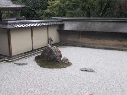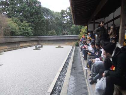 11月11日 高山寺の次に竜安寺に行きました。ここでは,有名な枯山水の庭を観ました。石の数のマジックをみんな知って驚いていました。壁の造りも勉強になりました。