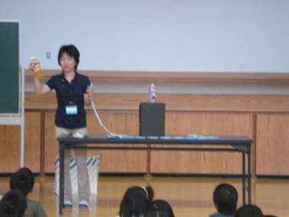 朝会で夏の飲み物について栄養教諭から栄養指導を行いました。