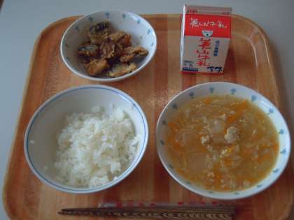 今日の献立は,ごはん・牛乳・いわしのかばやき風・とうがんのそぼろあんかけでした。とうがんのそぼろあんかけは,鶏肉とけずりぶしのだしがよくきいて,とてもおいしくいただきました。とうがんは,水分が多いのでのどの乾きをうるおしてくれます。夏にぴったりの食材です。
