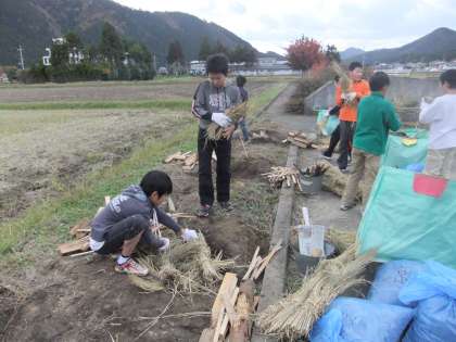 11月25日 今日は,全校焼きも大会の日です。1・2年生が育てたサツマイモを縦割り活動で準備をし,4時間目に焼きました。昨日準備したかまどにわらや割木,落ち葉を使って火を付け,その中にアルミホイルで包んだサツマイモを入れました。