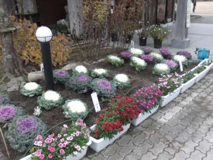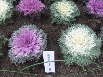 12月7日 年末年始にふさわしい葉ボタンを玄関に植えました。チリメンという種類とクジャクという種類です。大輪で立派なものです。