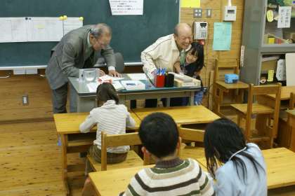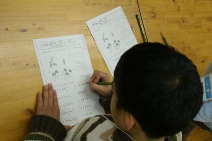 1年生達がやってきました。お約束のプリントに取り組んでいます。