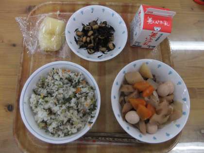 今日の献立は,菜めし・牛乳・関東煮・ひじき豆・りんごでした。大根葉と人参が入った菜めしは,彩りもよく子どもたちもよろこんで食べました。関東煮も大きな釜で炊くので,だしの味がよくしみ込んでいて,とてもおいしかったです。