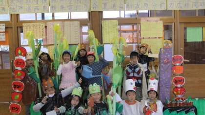学習発表会が終わり,みんなで作った道具や衣装と共に,記念写真を撮りました。