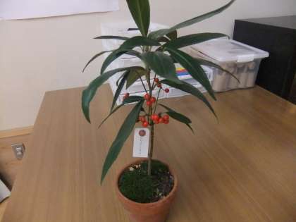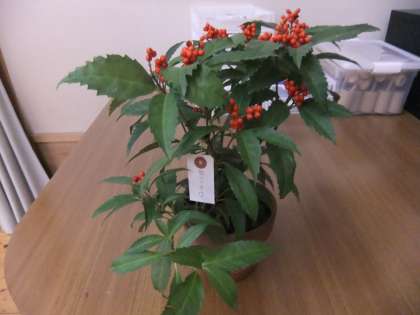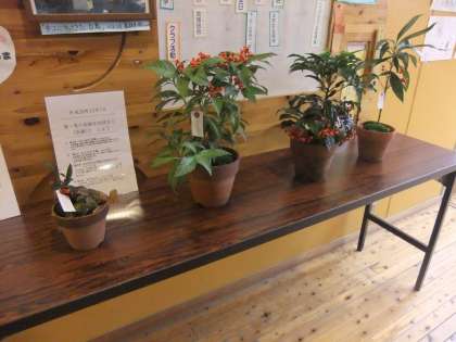 12月12日 今週も地域の方からこの時期の野草(樹木)が届きました。この4月からほとんど毎週届いています。今回は,ヒャクリョウ(百両)・センリョウ(千両)・マンリョウ(万両)・ヤブコウジの4鉢です。子ども達もその鉢の名前を読んで興味津津でした。