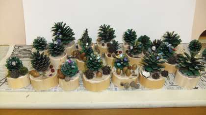 見つけた秋を使って、おたのしみ会のときのかざりつけ「クリスマスツリー」を作りました。まつぼっくりにカラースプレーで色をつけ、そこにビーズをくっつけて、土台の木にのせました。さらにまわりにどんぐりや木の実をつけて、かわいいツリーができあがり。同じ材料を使っていても、1人1人ちがう味わいの作品になりました。