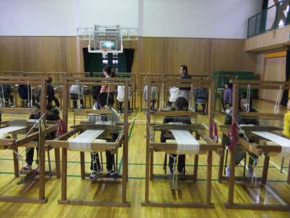 12月15日(木)の2・3校時に、京の「匠」ふれあい事業で、西陣織会館から5人の「匠」先生に来て頂き、実際に伝統工芸である西陣織を体験しました。みんな初めは、慣れないい手つきで、なかなか思うように織れませんでしたが、段々上手に織れるようになり、楽しそうに手織機にチャレンジしていました。