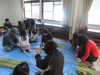 12月17日(土) 今日の午後,黒田基幹集落センターで地域に伝わるわら細工にチャレンジしようと,お正月に向けての「しめ飾り」を自作しました。地域のしめ縄名人にわらの編み方などを教わりながら,みんな思い思いの「しめ飾り」にチャレンジしていました。