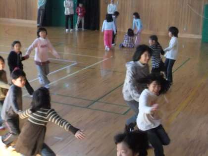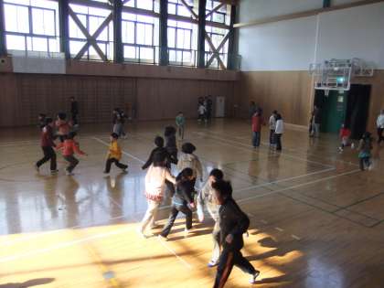 今日はは、中間休みに5年生主催の全校遊び(手つなぎ鬼)をしました。今日は運動場の乾きが悪く遊びべないので,体育館で行いました。みんな寒さを吹き飛ばすかのように力いっぱい走り回っていました。