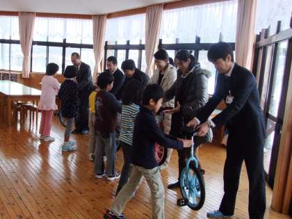 1月12日 本日,昨年の8月初旬に実施されました地域の方々による廃品回収の収益金で,一輪車とソフトバレーボールをいただきました。全校の子ども達は,このうれしいお年玉に大喜びでした。6人の地域代表の方から6人の代表の子ども達が受け取りました。
