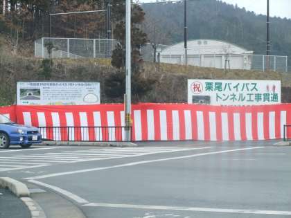 1月14日 先日まで張られてなかった紅白幕が工事の進行を告げる掲示板の前にかけられました。いよいよ貫通します。平成26年春の完成を目指して,工事現場の皆さん頑張ってください。京北の住民,子ども達も応援しています。
