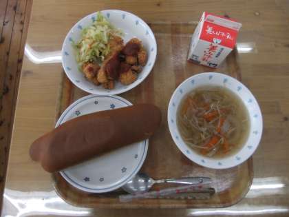 今日の献立は,黒糖コッペパン・牛乳・チキンカツ・ソティ・スープでした。チキンカツはみんな大好きで,サクサクの衣がとてもおいしかったです。