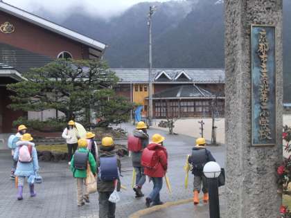1月23日 今朝の京北は,気温3度。登校してくる子どもたちは傘を差し,元気よく「おはようございます!」とあいさつをしていました。今週一週間は寒波が来るということを天気予報が朝から伝えていました。この雨が雪になるのでしようか。