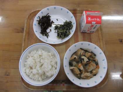 今日の献立は,麦ごはん・牛乳・厚揚げの野菜あんかけ・大根葉とじゃこのいためもの・こんぶ煮でした。厚揚げにとろっとしたあんがかかっていて,とてもおいしかったです。どれもごはんによく合うおかずで,ごはんがよく進みました。