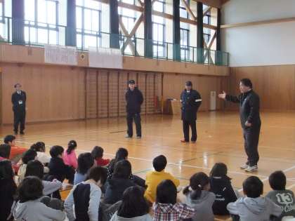 2月8日 教頭の校内放送で全校児童が体育館へ避難しました。児童・教職員の安全を確認後,お巡りさんから防犯についてのお話を聞きました。さすまたの使い方,護身術など実演しまがらしていただきました。最後に校長先生から「自分の身は,自分で守れるように常に大きな声が出せる訓練をしておこう。」「困った時は,近くの家に助けを求めよう。」などの話がありました。