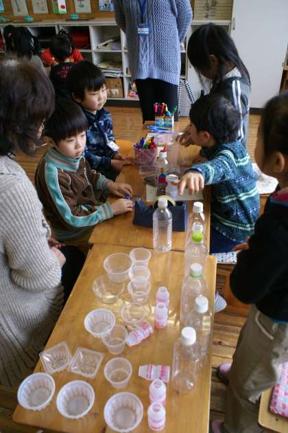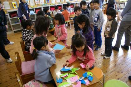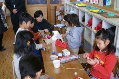 1年生の教室では,コーナー別にものづくりやゲームを楽しみました。