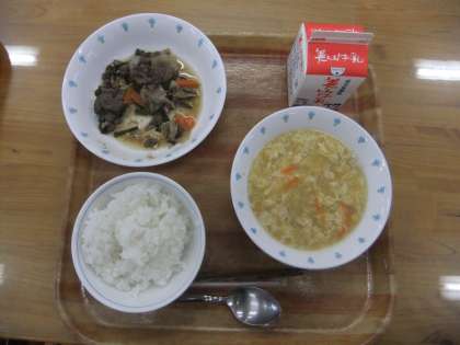 今日の献立は,ごはん・牛乳・プルコギ・中華コーンスープでした。プルコギはごはんにとても合って、大変おいしくいただけました。中華コーンスープも温かくておいしかったです。