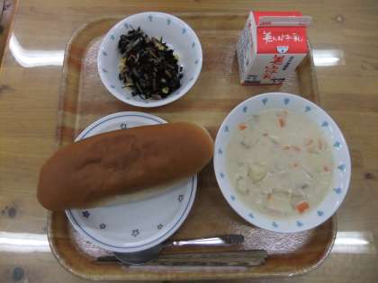 今日の献立は,ミルクコッペパン・牛乳・じゃがいものクリームシチュー・ひじきのホットマリネでした。ひじきのホットマリネは,ひじきと大根,ベーコン,人参,コーンをオリーブ油で炒めて,酢のさっぱりした味で仕上げました。子どもたちもおいしくいただきました。