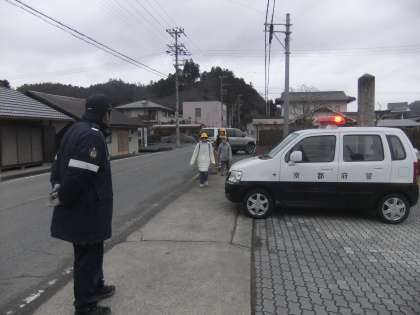 2月16日 今朝の京北7時現在マイナス1度。この2〜3日は気温が若干高く,マイナスを示していませんでした。しかし,今日は久しぶりにマイナスを示していました。子どもたちもお巡りさんに見守られて,元気に登校してきました。1年生は,教室のテラスに置いていた氷づくりの器をのぞいていました。出来ているかな?