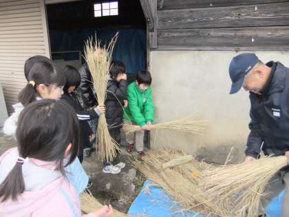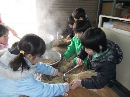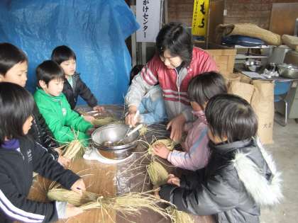 2月16日 3年生が納豆体験学習に山国さきがけセンターに行きました。今日は,わらづとづくりと煮豆をわらづとに入れました。明日は,発酵してわらづと納豆が温まっている様子を体験しに行く予定です。