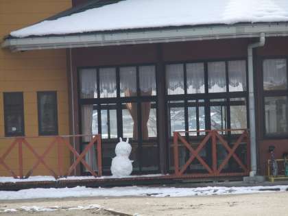 2月22日 今日の京北は気温0度,快晴で気持ちのよい朝を迎えています。校庭では,小鳥もピヨピヨと楽しそうにさえずっています。運動場の雪もすっかり溶け,ランチルームのテラスの雪だるまが寂しそうに立っています。日差しを浴びて,二宮仁徳像も温かそうです。