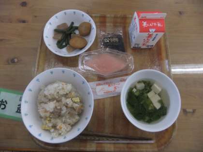今日の献立は,ちらしずし・牛乳・平天の煮つけ,菜の花のしまし汁・三色ゼリーでした。おひなさまメニューで,どれも大変おいしかったです。特に三色ゼリーは,子どもたちには好評で,楽しみながら食べていました。