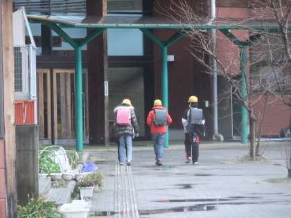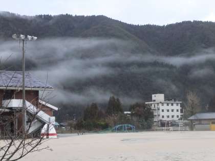 3月6日 昨日一日中降った雨もようやく上がり,今日は暖かな日差しが校舎に当たっています。校長室には,小鳥のさえずりも聞こえます。バスの都合で一番早い登校に子どもたちがやって来ました。学校から少し離れた上桂川の上には帯状の雲がかかっています。