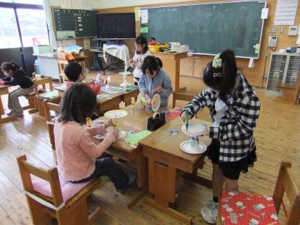 図画工作「コロコロゆらゆら」で、ころんとまわるしくみをつかって、おもちゃを作りました。色画用紙やビニールテープをはりつけたり、色をぬったりして、きれいにかざりつけをしました。