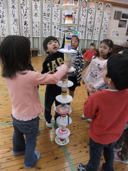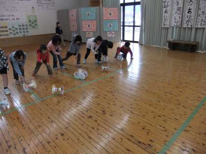 最後には、ホールで転がしてみました。転がすだけでなく、積んでみたりして、楽しく遊べました。