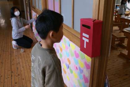 3月「なかよしの日」の取組で郵便局を開設しました。1年間お世話になった方や友だちに感謝の気持ちを表す手紙を送ります。2年生が郵便屋さんになります・