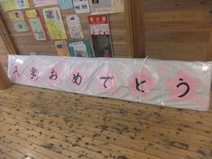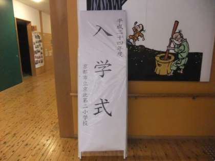 4月5日 午後入学式の準備が終わりました。在校生がつくった「おめでとう」の看板が出番を待っています。