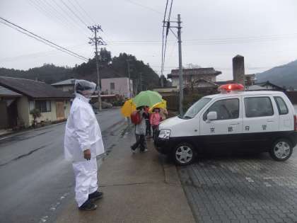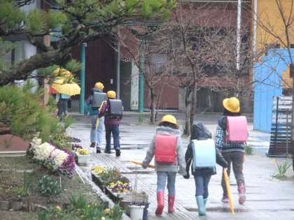 4月11日 今朝の京北は,朝から雨模様です。子どもたちも傘を差して元気に登校しています。駐在所のお巡りさんのお迎えに元気に挨拶しています。桜並木の桜はまだ一輪も咲いていません。ピンクがかっていますがもう少しです。