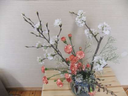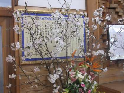 4月11日 校内の大きな花瓶に挿してある桜は,見事に満開です。これは,入学式に花を咲かそうと入学式一週間前に温室や職員室であたためた桜です。寒冷地ならではの工夫です。