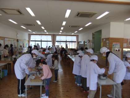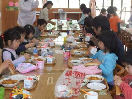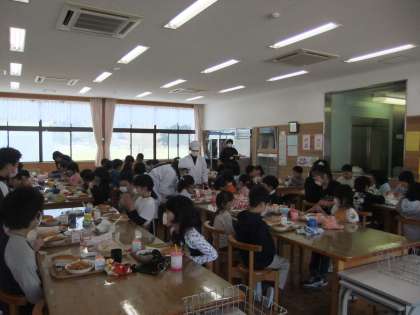 4月12日 今日は,今年度最最初の給食です。京北第二小学校では,全校児童と全教職員が一緒にランチルームで食べます。新1年生も他の学年より少し早く,給食の用意をして,みんなおいしそうに楽しく食べていました。