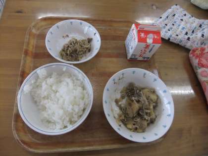 今日の給食の献立は,ごはん・牛乳・肉じゃが・もやしのごまいためでした。どれもたいへんおいしくいただけました。みんなしっかり食べていました。