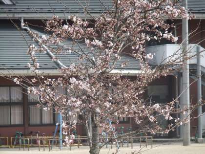4月14日 京都市内のあちこちで桜が散り始めているという声を聞きますが,京北第二小学校の桜の木15本はようやく咲き始め,正門から昇降口までの桜並木の桜も昨日の雨で7分咲きまでいきました。しかし,3本のしだれザクラはまだまだです。来週の全校お花見昼食には満開になってほしいものです。