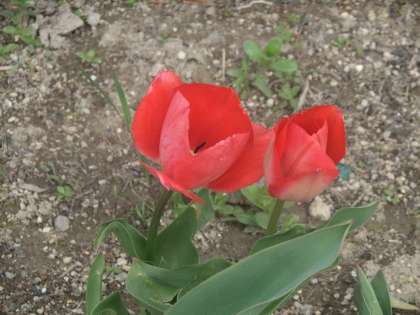 4月17日 いつまでも気温が低く,咲き出さなかったチューリップがようやく咲き出しました。今日は,赤と黄色とピンクが色鮮やかに一日でつぼみを広げました。とても綺麗です。