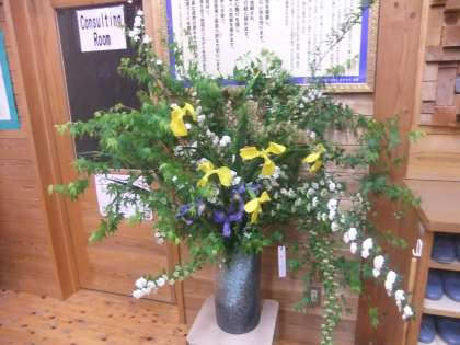 5月8日 春は,校内のあちこちにいっぱい咲きます。今日は,ショウブ・アヤメ・コデマリなどを生けました。春のモミジの中に黄色や紫の花が栄えています。