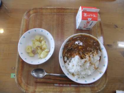 今日の献立は,ごはん・給食・ハッシュドビーフ・ジャーマンポテトでした。ハッシュドビーフは子どもたちに大変好評でおいしそうに食べていました。ジャーマンポテトも,味付けもよくとてもおいしくいただけました。