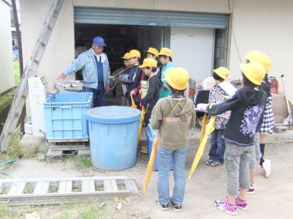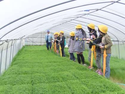 そして,大きなコンバインに子どもたちは驚き,暖かいビニールハウスの中にある苗を見学させてもらいました。子どもたちはゲストティーチャーの方に質問をしたり説明を聞いたり,熱心にメモを取ったりしていました。