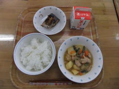 ごはん・牛乳・さばのしょうが煮・鶏肉と野菜の煮つけでした。さばの煮つけは、一年生は初めてでしたが、がんばって骨をとってきれいに食べられました。鶏肉と野菜の煮つけは、新たまねぎがやわらかくて甘かったです。じゃがいもも、鶏肉ややさいのうまみがよくしみこんでいておいしかったです。