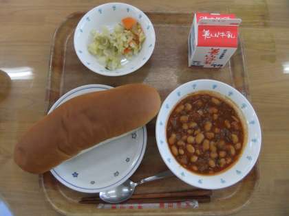 今日の献立は、ミルクコッペパン・牛乳・大豆と牛肉のトマト煮・野菜のホットマリネでした。大豆と牛肉のトマト煮は、ホールトマトをよく炒めて、牛肉や大豆と一緒に煮込んでいただいたので、トマトの濃厚なうまみが口の中に広がって、とてもおいしかったです。野菜のホットマリネもりんご酢の味付けがさっぱりしていて、おいしかったです。