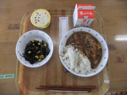 今日のの献立は,麦ごはん・牛乳・チキンカレー・ひじきのソティ・プリンでした。チキンカレーは,スパイスもよく効いていて大変おいしくいただけました。ひじきのソティもおいしかったです。プリンは子どもたちも大好きで喜んで食べていました。