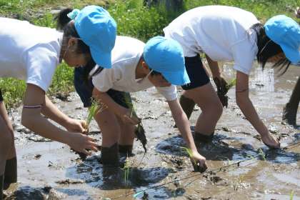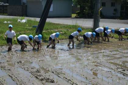 5年生が総合的な学習の時間に田植えをしました。秋には収穫をして,お餅つきを予定しています。