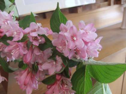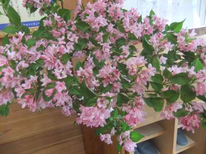 5月22日 今週の玄関の花は,タニウツギです。今,野山にピンク色に咲いています。今朝,採ってきて生けました。今朝からほんのり甘い香りが玄関に漂っています。