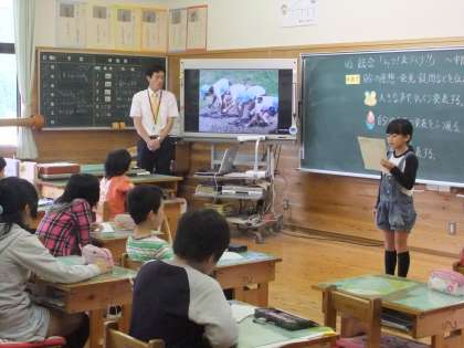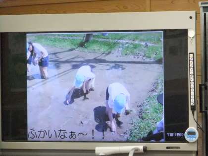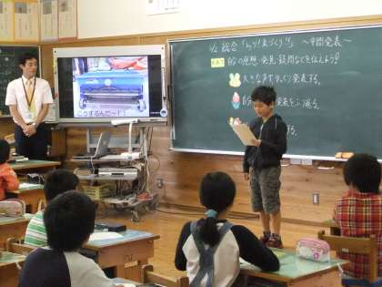5年生は,総合的な学習の時間で,「米づくり」について,これまで見学したことやこれから調べたいことを,電子黒板の写真を見ながら発表しました。