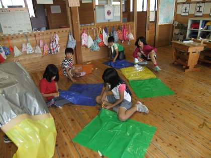 はじめは班でつなげ、次は2つの班でつなげ、最後は全部をつなげて、長いトンネルを作りました。つなげる時に色も工夫しました。