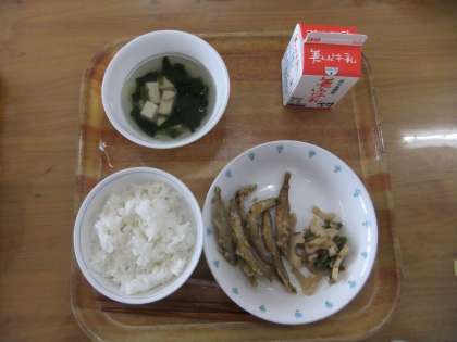 今日の献立は,ごはん・牛乳・わかさぎのこはくあげ・伏見とうがらしのおかか煮・すまし汁でした。わかさぎのこはくあげは,カラッと揚がっていておいしかったです。伏見とうがらしのおかか煮は,ごはんによく合い,ごはんと一緒に食べるととても美味しく頂けました。