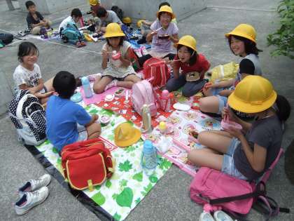 駅ビルの屋上で昼食です。おうちの人が心をこめて作ってくれたお弁当に、笑顔がこぼれます。