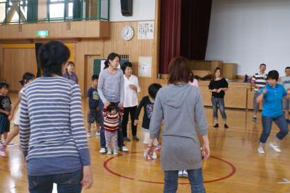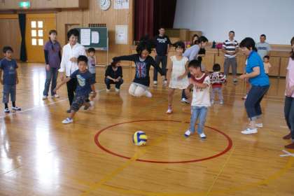 午後からは、体育館で転がしドッジボール しっぽとり 親子対抗リレーをします。